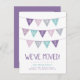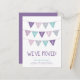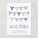 Diseño de tarjeta postal de anuncio de mudanza moderno, lindo y simple con una encantadora bandera de banderines multicolor que dice HOGAR DULCE HOGAR en una fuente manuscrita con espacio para agregar su nueva dirección debajo. Agregue un mensaje en el reverso o déjelo en blanco para escribir una nota manuscrita. Haga clic en el botón PERSONALIZAR para personalizar las fuentes, mover el texto y crear un diseño de tarjeta postal único y personalizado.