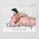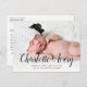 Esta postal de anuncio de nacimiento de bonito incluye un nombre de extracto y una foto grande. En la parte delantera de la postal, puedes añadir una foto horizontal de tu recién nacido. En la parte delantera también hay un texto negro que muestra el nombre de su bebé en caligrafía moderna. A continuación, agregue los detalles de nacimiento y sus nombres. En la parte trasera de la postal, encontrarás espacio para escribir un mensaje personalizado más largo a tus seres queridos.