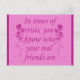 mostrar a los que te preocupas que los apoyas en tiempos de crisis. fondo rosa que dice "en tiempos de crisis, sabes quiénes son tus amigos reales"