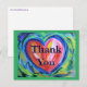 El mensaje de la postal dice: "Gracias". La pintura presenta un corazón rojo colorido con destellos de acentos blancos y dorados. El corazón está delineado en azul y tiene un fondo verde suave. Esta pintura del corazón es un tributo a mantener la esperanza dentro de tu corazón cuando los azules tristes te rodean, pero seguir adelante para una renovación verde.