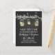tarjeta postal de aviso de fecha de guardar con fondo de pizarra rústica y luces colgantes grises y frascos mason