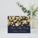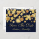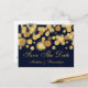 Este diseño moderno y elegante cuenta con un patrón de puntos bokeh dorados sobre un fondo azul marino. Personaliza esta postal con la información de tu boda.