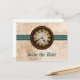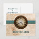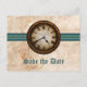 Esta tarjeta postal de "Save the Date" de reloj antiguo presenta un reloj vintage centrado prominentemente en la parte superior de una cadena de bolas de metal y un borde elegante a rayas teal. El aspecto desgastado del fondo de textura de papel grungy completa el ambiente antiguo de este diseño único. Esta tarjeta postal de "Save the Date" es perfecta para anunciar su boda inspirada en el estilo vintage o steampunk. Fácil de personalizar, simplemente agregue los detalles de su boda en los espacios proporcionados. Haga clic en "Personalizar" para encontrar opciones adicionales para personalizar este diseño.