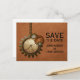 Esta única tarjeta postal de "Save the Date" de boda con reloj vintage en naranja oscuro presenta relojes antiguos de estilo steampunk y engranajes colgando de una cadena de cuentas de metal. El fondo tiene un papel texturizado y una superposición de malla que añade un toque de desaliño y un estilo grunge al diseño. Esta tarjeta de "Save the Date" extravagante y original sería perfecta para anunciar tu boda inspirada en steampunk. Fácil de personalizar, simplemente añade los detalles de tu boda. Haz clic en el botón "Personalízalo" para encontrar opciones adicionales de personalización.
