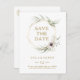 Esta tarjeta postal de aviso de fecha de eucalipto dorado geométrico es perfecta para tu boda boho elegante. Está diseñada con sencillas flores blancas y púrpuras de anemona bohemia, hojas de salvia verde agua simplistas y marcos de invierno con lámina dorada modernos. Con la combinación de flores blancas y follaje rústico simple, seguro que crearás la atmósfera de tus sueños.