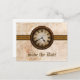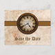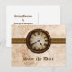 Esta tarjeta postal de "Save the Date" de reloj antiguo presenta un reloj vintage centrado prominentemente en la parte superior de una cadena de bolas de metal y un borde elegante a rayas marrón oxidado. El aspecto desgastado del fondo de textura de papel grungy completa el ambiente antiguo de este diseño único. Esta tarjeta postal de "Save the Date" es perfecta para anunciar su boda inspirada en el estilo vintage o steampunk. Fácil de personalizar, simplemente agregue los detalles de su boda en los espacios proporcionados. Haga clic en "Personalizar" para encontrar opciones adicionales para personalizar este diseño.