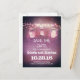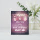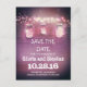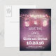 Tarjeta postal de aviso de fecha con fondo de madera rústica y luces colgantes moradas en frascos de mason.