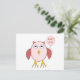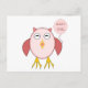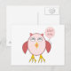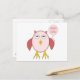 Esta tarjeta postal linda presenta un dibujo animado de un búho rosa con ojos somnolientos, un pico abierto y plumas esponjosas lindas. El búho sostiene un globo rosa chicle. Hay un texto rosa bonito dentro del globo que dice, “Bebé Niña”. Este es el regalo perfecto para celebrar a una recién nacida.