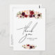 Una encantadora tarjeta postal para enviar mensajes de agradecimiento a sus invitados de boda. Cuenta con flores de acuarela de color rojo burdeos y rosado. Puede editar el texto y los colores.