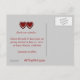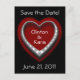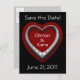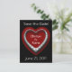 Una tarjeta postal de boda con un corazón plateado con incrustaciones de diamantes sobre un corazón rojo con fondo negro. En el centro hay un espacio para los nombres de la novia y el novio. En la parte superior están las palabras "¡Guardar la fecha!" con espacio para la fecha de la boda en la parte inferior. En el reverso hay un fondo gris con corazones dobles y texto elegante en rojo para poner todos los detalles del anuncio de la boda. ¡Una excelente manera de anunciar su día especial!