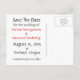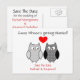 Tarjetas postales personalizadas de boda para guardar la fecha, con gráficos de dibujos animados dulces de dos búhos grises con lunares negros y blancos, con un corazón rojo entre ellos. Texto negro y rojo, en la parte delantera y trasera de la tarjeta listo para personalizar para leer lo que desees. Una excelente manera de anunciar tus planes de boda con anticipación.