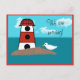 Tarjeta postal de cambio de dirección al mudarse a la playa, océano, faro rojo y blanco y gaviota