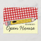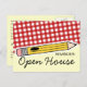 Una tarjeta postal que presenta un diseño en la parte frontal que consiste en gingham rojo y un lápiz amarillo. El texto dice "RECORDATORIO: Casa abierta". Personalice la parte posterior con los detalles de su evento.