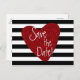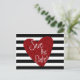 Tarjeta postal de corazón de purpurina roja con rayas negras y blancas. Personaliza con cualquier texto para cualquier evento.