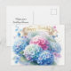 Esta tarjeta postal diseñada con elegancia muestra flores de hortensias de color pastel, acentuadas artísticamente con brillo. Una banda dorada presenta un saludo de "Feliz Cumpleaños". El reverso lleva el mensaje "Espero que tu cumpleaños florezca con felicidad y dulces sorpresas". Compra esta tarjeta postal tal como está, o personaliza la plantilla con tu propia imagen y mensaje de cumpleaños. También puedes transferir esta obra de arte a otro producto.