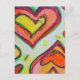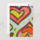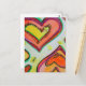 Los corazones amarillos, melocotones y naranjas forman dos corazones concéntricos deslizándose hacia la otra punta a la punta. Los puntos de color amarillo pálido son como el confeti entre los corazones. La pintura acuarela tiene una capa clara de oro y rosa encima.