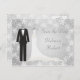 Tarjeta postal de guardar la fecha de boda con esmoquin y vestido contra un fondo de copos de nieve plateados