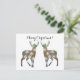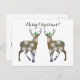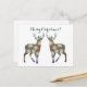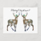 Feliz postal navideño con dos ciervos y copos de nieve encima.