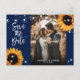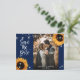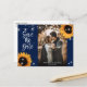 Tarjetas postales de foto para guardar la fecha de boda con diseño floral rústico con girasoles y luces de cuerda sobre un fondo de arpillera. Diseño de tarjeta ideal para una boda rústica de azul marino inspirada en girasoles.