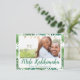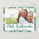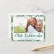Hojas verdes tropicales bordean tu foto. Debajo de tu imagen está el texto que desea a tus amigos y familiares Mele Kalikimaka, hawaiano para Feliz Navidad. Tu apellido se imprime debajo del saludo navideño. El texto se imprime con dos fuentes coordinadas en verde navideño. Un simple saludo navideño se imprime en el reverso de la postal junto con tus nombres. El texto se imprime con una fuente verde de vacaciones. Para vestir la postal sobre la línea de la dirección hay un texto con letra script que indica Al Sr. Cartero Por favor, entregue a: con espacio debajo para la dirección manuscrita.