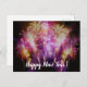 Tarjeta postal adornada con diseño de fuegos artificiales de Feliz Año Nuevo.