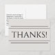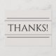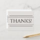 Esta tarjeta postal de agradecimiento elegante presenta el mensaje "GRACIAS" en la parte delantera, junto con un mensaje personalizado en la parte trasera. Podría ser utilizada para mostrar gratitud a alguien que ha hecho algo especial.