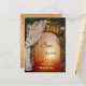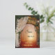 Tarjeta postal de guarda la fecha con una entrada que conduce a una luz mágica en un bosque encantado. El velo de novia con rosas y la linterna crean una atmósfera romántica.