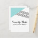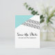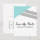 Tarjeta postal de guardar moderna y trendy con franja geométrica y triángulo turquesa y acento de franjas finas. Esta postal simple pero elegante está configurada para personalizarse fácilmente con la información de su boda. Encuentre más opciones de personalización haciendo clic en Personalizar.