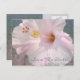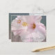 Una tarjeta postal de guardar la fecha con una foto de un hibisco rosa claro sobre un fondo de agua de mar brillante y clara. El texto blanco dice "Guardar la Fecha". El lado opuesto presenta un fondo coincidente.