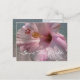 Una tarjeta postal de guardar la fecha con una foto de un hibisco rosa sobre un fondo de agua de mar cristalina y brillante. El texto en blanco dice "Guardar la Fecha". El lado opuesto presenta un fondo coincidente.