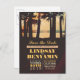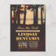Romántica y antigua, pero moderna tarjeta de guardar la fecha en la playa con una cadena de luces o luces centelleantes colgando de las palmeras.