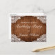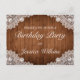 Invitación postal de la fiesta de cumpleaños. Estilo rústico con un fondo de madera y decoración de encaje blanco. Hay más artículos disponibles en este estilo en nuestra tienda. Puede editar el diseño más adelante, cambiar colores, fuentes y añadir texto extra haciendo clic en el enlace "personalizar más adelante".