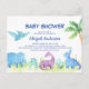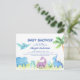 Cute Brachiosaurus, Stegosaurus, Pterodactyls, Dinosaurios que tienen Verdor tropical Agua botánica de color verde y azul Oh Boy Baby Shower Invitation Post Card sobre fondo blanco con bebé TRex - incluye hermosa y elegante tipografía de escritura con palmeras tropicales modernas y vegetación para la celebración especial de Madre a Ser.