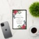 La elegante invitación a la fiesta para Navidades incluye dos estribillos florales decorando un marco de Relieve metalizado dorado. Los manantiales tienen rosas rojas, flores de algodón blanco, cañas de caramelo, pino y vegetación holgada. La parte posterior de la tarjeta postal le da un amplio espacio para enviar saludos de vacaciones y cualquier instrucción para su fiesta Navidad.