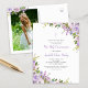 Tarjetas de invitación personalizadas asequibles para la Primera Comunión. Este bonito diseño femenino tiene un borde floral de acuarela con flores púrpura pastel y vegetación. Personalice el diseño con los detalles de la Primera Comunión de su hijo. El reverso tiene espacio para una foto con su dirección de devolución impresa para facilitar el envío. Haga clic en Personalizar para elegir cualquier color de fondo y editar las fuentes y colores del texto para crear una invitación de Comunión única en su tipo.