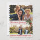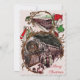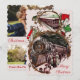Tarjeta de Navidad antigua con una escena de personas subiendo a un tren en Navidad en la parte delantera. Tus fotos personalizadas y saludo personalizado en la parte posterior.