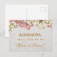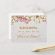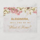 Esta elegante postal de propuesta "¿Serás mi dama de honor?" tiene un fondo de mármol y orquídeas rosadas y blancas en su borde superior.