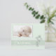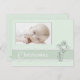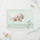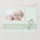 Elegante postal de invitación a un bautizo neutro de género en verde suave con guarnecido de encaje y crucifijo ornamentado. Inserte la foto de su propio hijo para un conservador especial. com