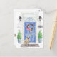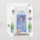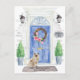 Anuncie su nueva dirección con nuestra elegante invitación con un gato Ragdoll, una puerta delantera azul, una alfombra de bienvenida, un cartel de pizarra, topiarios y una corona floral sobre un fondo de ladrillo gris.