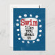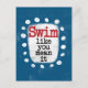 Un diseño tipográfico de nadador lindo que dice "Nada Como Si Lo Dices Enserio". Cuenta con texto negro y rojo en un rectángulo blanco con puntos blancos divertidos y juguetones que lo rodean, todo sobre un fondo azul.