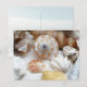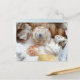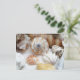 Postal de conchas en blanco. Pequeñas conchas tropicales recolectadas a lo largo de la costa del Golfo de Florida decoran la parte delantera de esta postal. Una espiral natica vista es el punto central, con la concha de un pequeño gatito naranja y el caparazón de la caja de joyas espinosas blancas también en la foto. La imagen está bordeada por un marco de línea delgada. Revertir es luz sólida y color de color. No hay texto en esta tarjeta. Úsalo para saludar, o para cualquier ocasión.