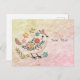 Tarjeta postal de pájaro pequeño deja flores rosad