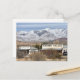 Postal de Saloon pionero con foto de The Pioneer Saloon y la tienda general Goodsprings durante el invierno con nieve en las montañas circundantes.