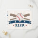 AGREGUE LAS INICIALES DE LA NOVIA Y EL NOVIO A ESTA MONA Y FORMAL TARJETA DE RESPUESTA PARA UNA BODA CON TEMA DE BÉISBOL, FIESTA DE DESPEDIDA DE SOLTERA O PAREJA, FIESTA DE ANIVERSARIO O CENA DE COMPROMISO. UN DISEÑO DE BATE Y PELOTA DE BÉISBOL CRUZADOS SOBRE UN FONDO DE RAYAS BLANCAS Y CREMA. AGREGUE EL MONOGRAMA DE LA NOVIA Y EL NOVIO A CADA LADO DEL CORAZÓN BLANCO EN EL DISEÑO DE ETIQUETA CON CINTA IMPRESA. RSVP EN AZUL MARINO IMPRESO EN UNA FUENTE DE EQUIPO DEPORTIVO DE LA LIGA DE BÉISBOL CON CORAZONES ROJOS FLANQUEÁNDOLO. DERECH