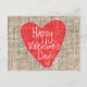 Tarjeta postal de San Valentín con corazón rojo de arpillera. Personalice con cualquier texto para cualquier evento. Artículos coincidentes en mi tienda.