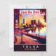 Invitación de boda para guardar la fecha de Tulsa, tarjeta postal de viaje. Hermosa puesta de sol en la ciudad en colores vibrantes.
