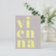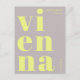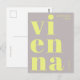 Envía un saludo elegante desde Viena, Austria con esta tarjeta postal tipográfica moderna. El diseño presenta la palabra Viena dividida en tres líneas en letras minúsculas decorativas y en negrita, en amarillo brillante sobre un fondo gris. Arriba, la frase saludos desde está escrita en una fuente sans serif delgada y elegante, lo que añade un toque sutil y moderno. Perfecta como recuerdo de vacaciones, acento decorativo o para enviar a casa desde tu ciudad favorita. Un diseño minimalista pero llamativo para amantes de la estética contemporánea y recuerdos de viaje.