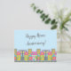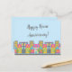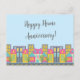 Tarjetas postales con letra caprichosa "Feliz aniversario de casa" para marketing inmobiliario. El diseño presenta un barrio urbano lindo sobre un fondo azul claro. Perfecto para agentes inmobiliarios residenciales, prestamistas hipotecarios, agencias de títulos, servicios de inspección de viviendas, etc. Agregue su información comercial y foto o logotipo. Enviar tarjetas postales ahorra papel, sobres y franqueo en comparación con las tarjetas de felicitación doblables.