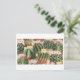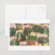 Esta tarjeta postal presenta un jardín de cactus lleno de cactus con flores espinosas.