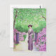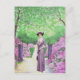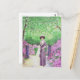 Una postal personalizado que presenta a una elegante dama de época en un jardín de rododendros.
